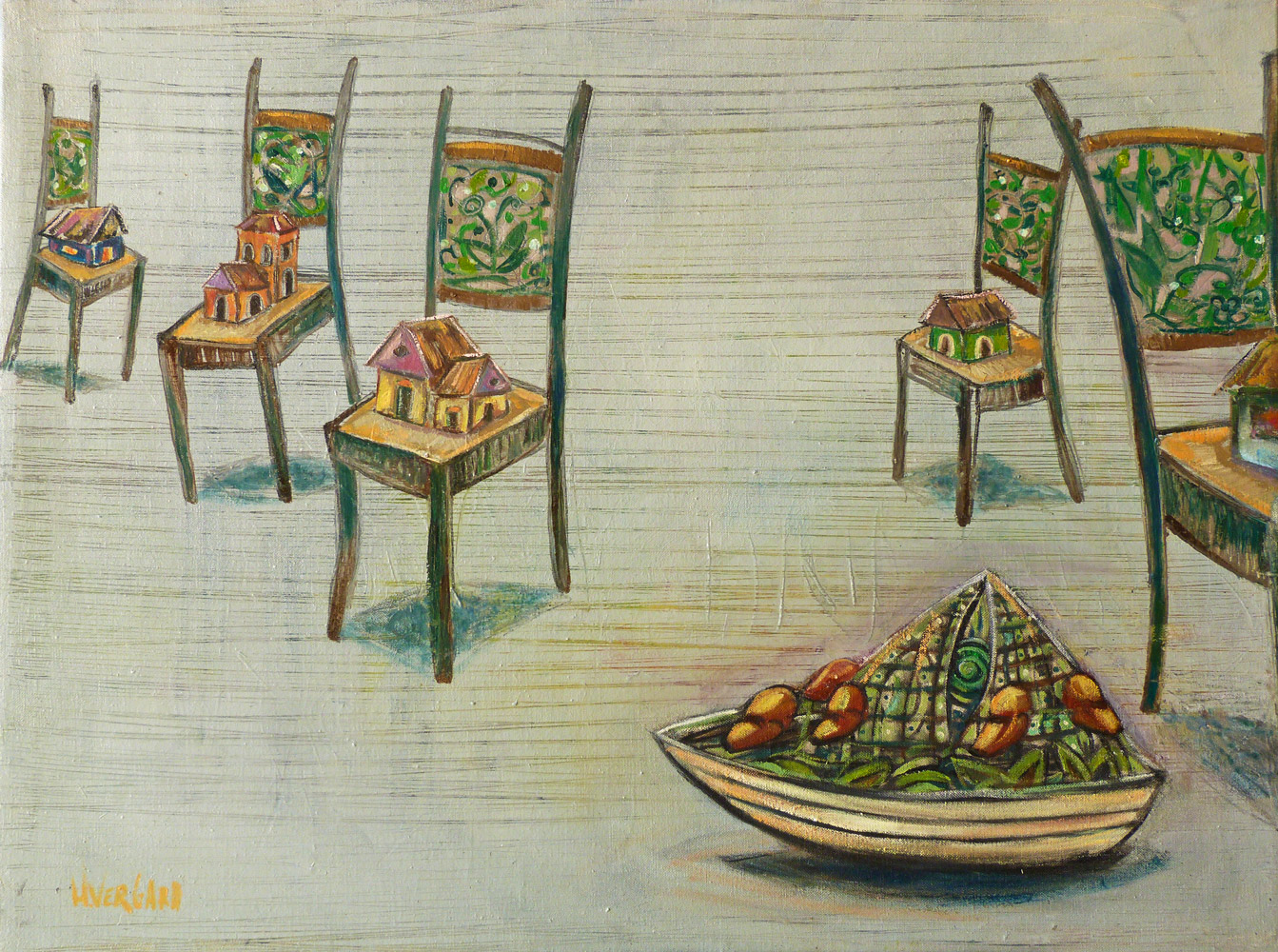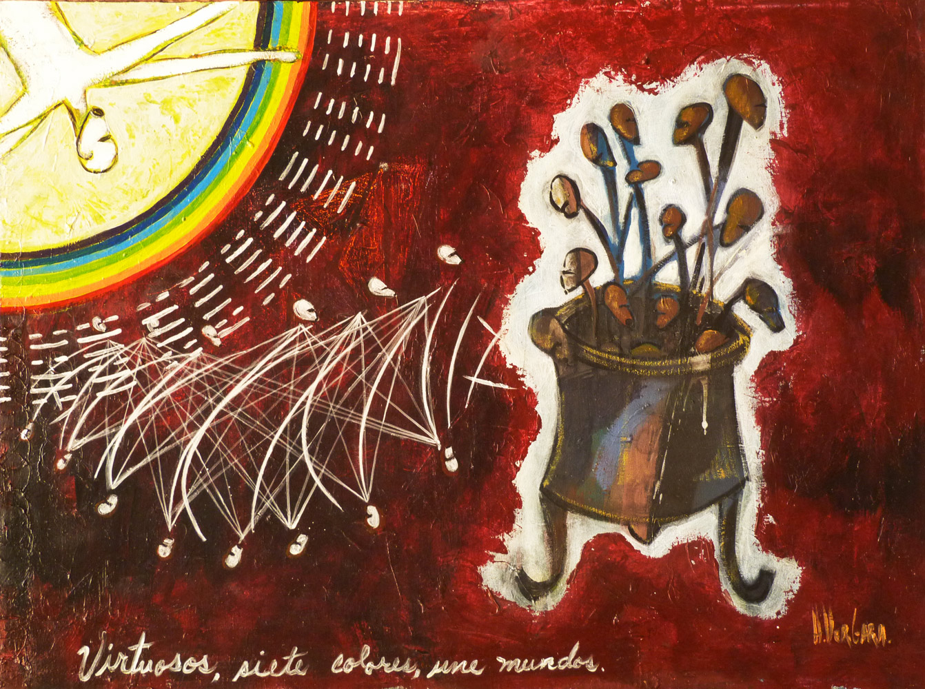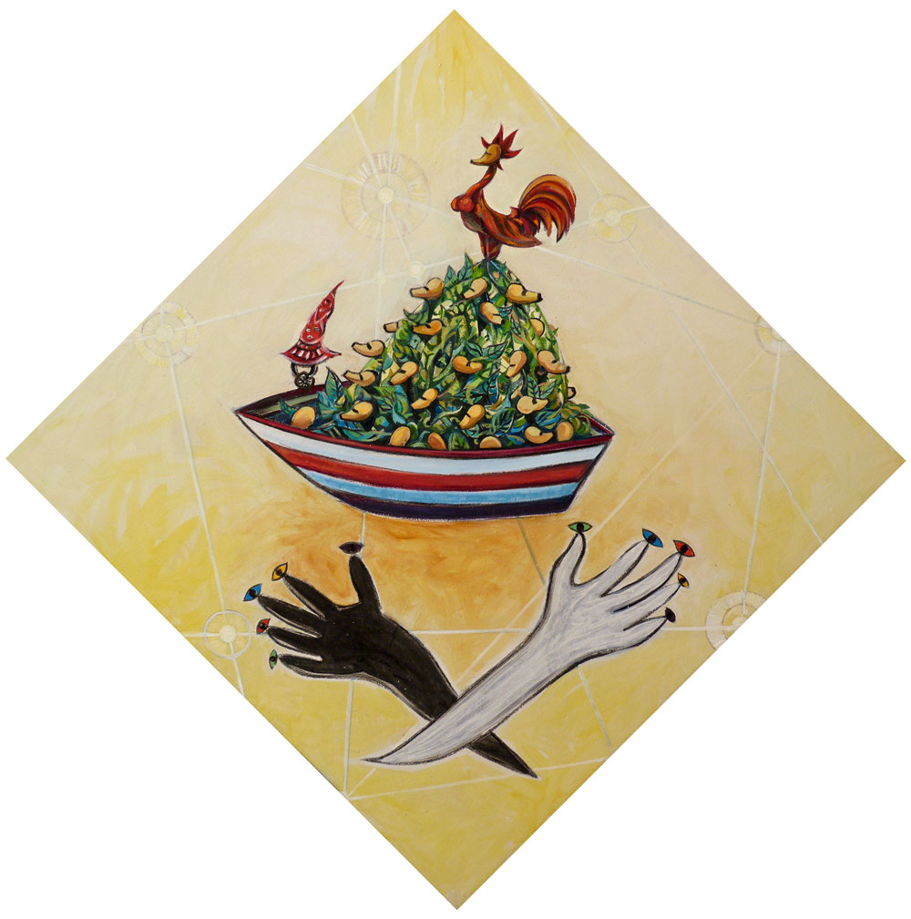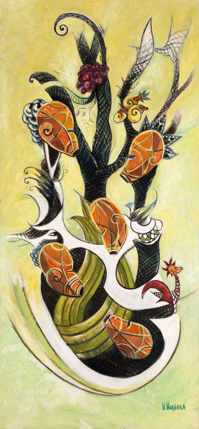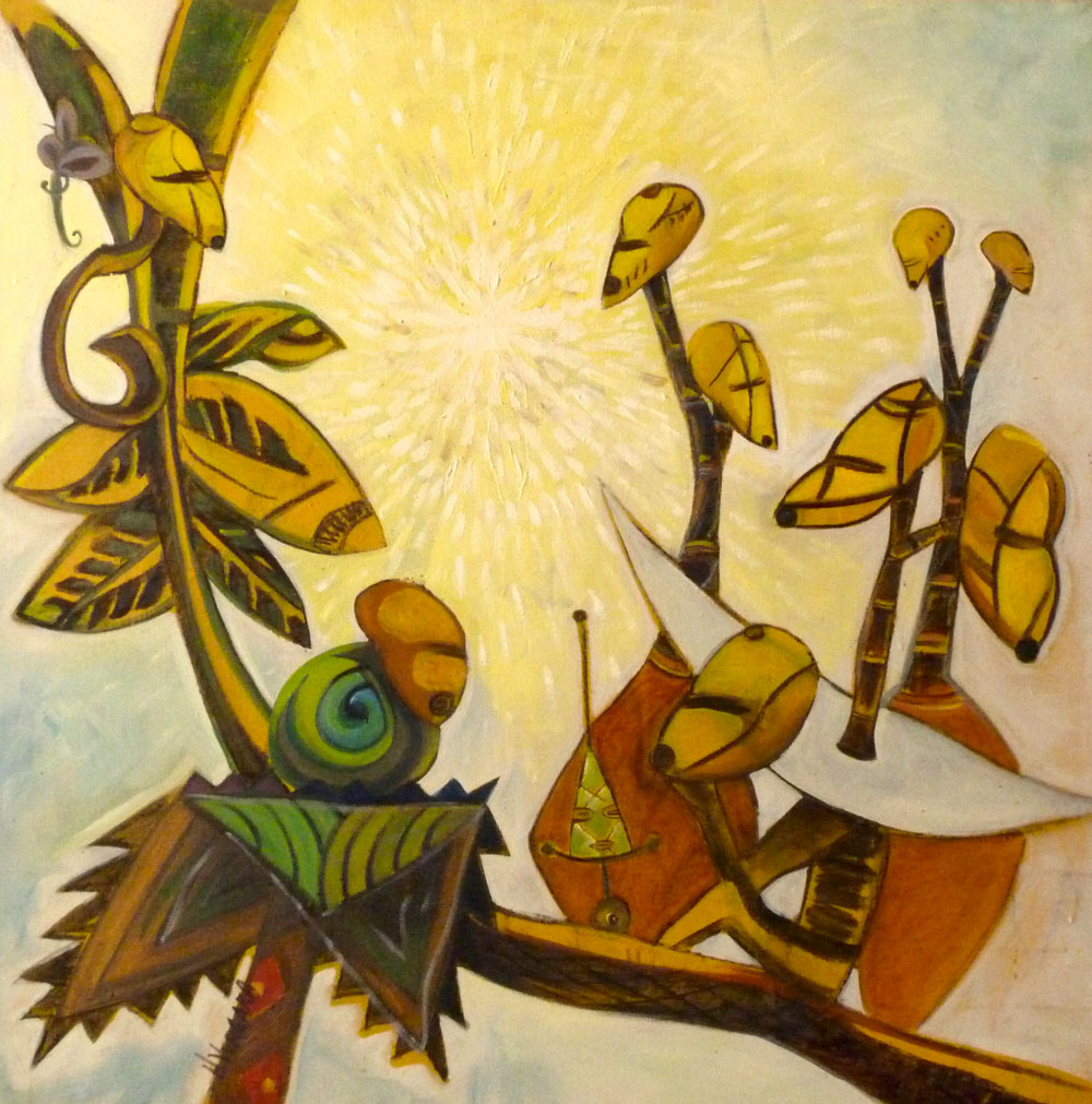 Les Virtuoses, créatures hybrides au corps animal, végétal ou humain, immobiles, affairées à diverses tâches ou en pleine migration, sont pour l’artiste les gardiens de la vie et de la spiritualité.